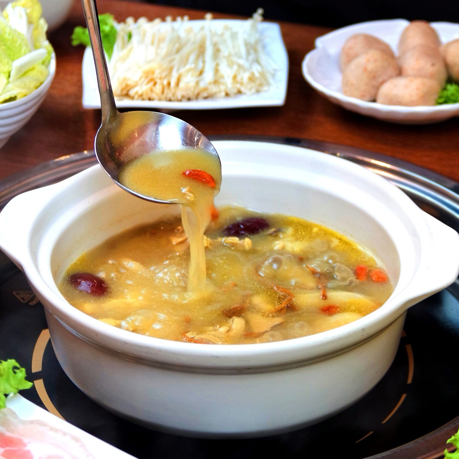 如果火锅是音乐会,那汤底就是灵魂指挥!在这里,每一锅汤底都经过8小时的慢火细熬,完美平衡了鲜香与滋补。精选药材如当归、党参、枸杞、红枣,与新鲜猪肚、走地鸡共同炖煮,汤汁浓郁却不腻口。