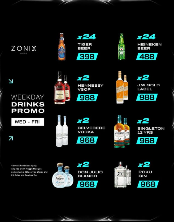 - Free Flow Night(周四) —— 女生 RM58 无限畅饮,男生 RM98 随心畅饮,畅快至极!